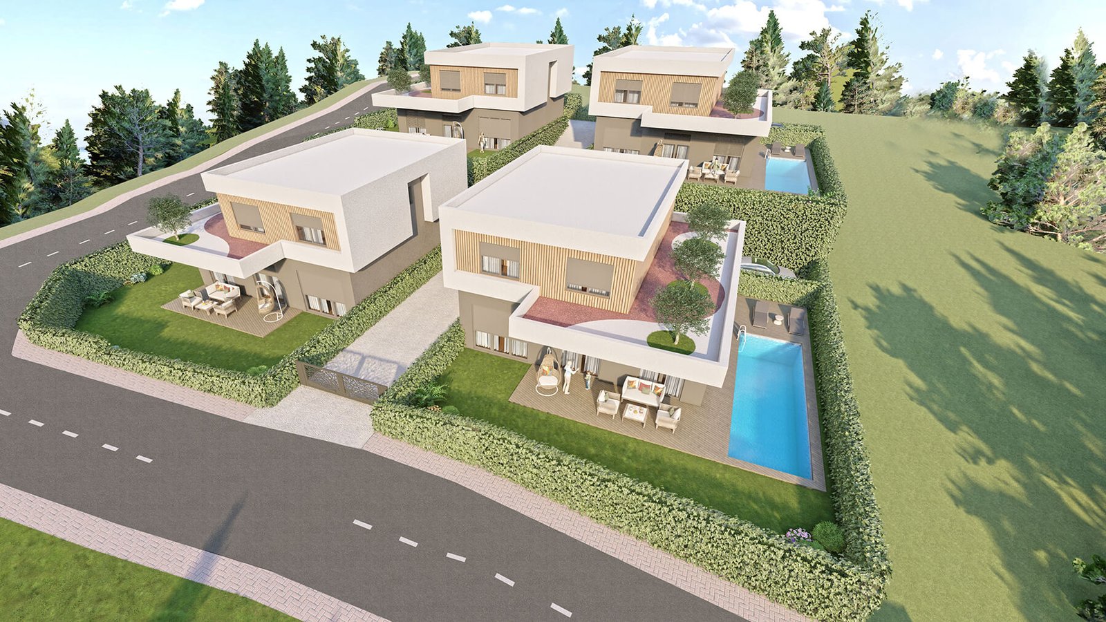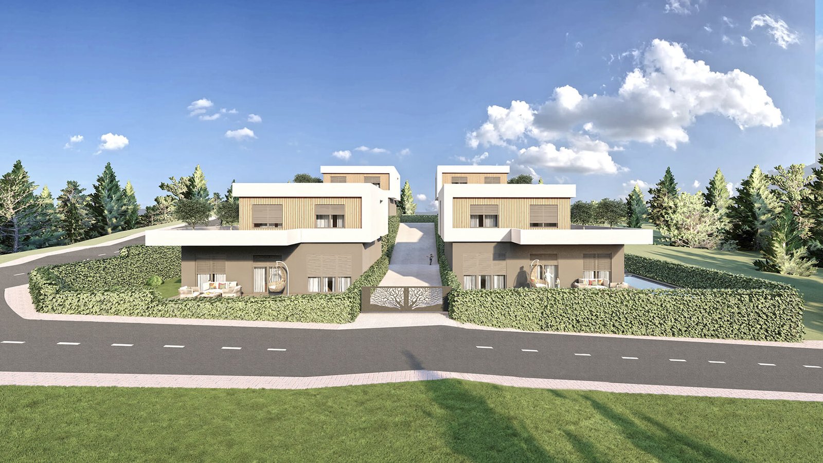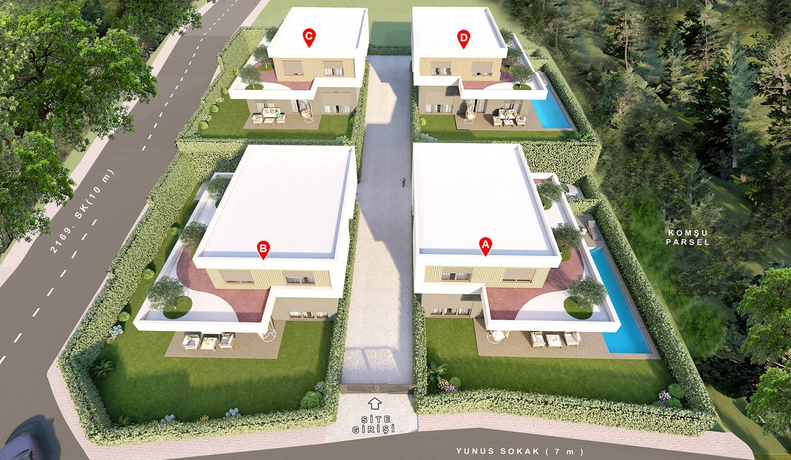 Merkezi konumda, yarı açık otoparkı ve özel yüzme havuzu olan site içerisinde 4 adet villadan oluşan 270 m2 Brüt Kullanım alanlı 2 katlı Eris Villaları
